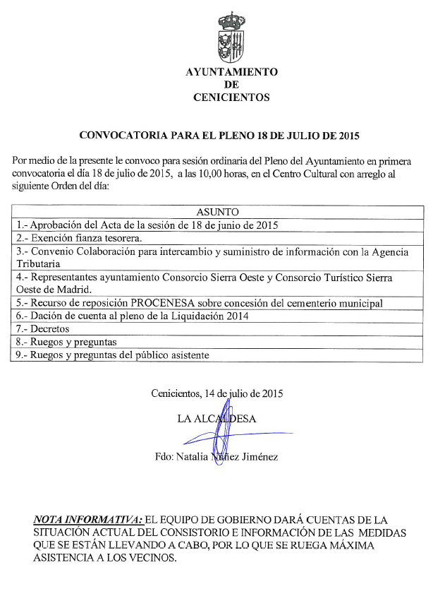 El próximo sábado, 18 de Julio, a las 10:00 horas en el Centro Cultural, la alcaldesa de Cenicientos explicará la situación actual del Ayuntamiento y responderá las preguntas de los vecinos, con el siguiente orden del día: